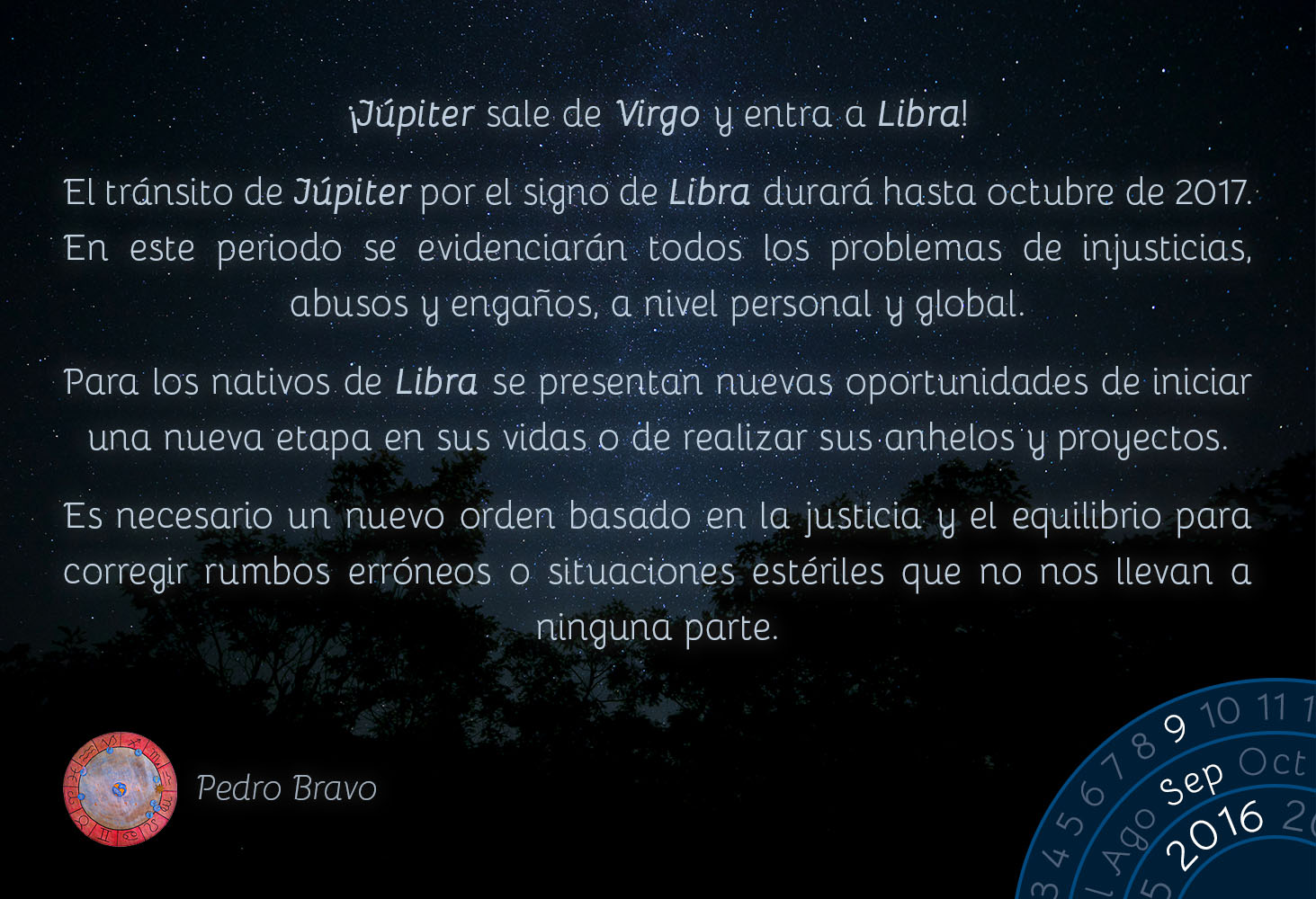 ¡Júpiter sale de Virgo y entra a Libra!El tránsito de Júpiter por el signo de Libra durará hasta octubre de 2017. En este periodo se evidenciarán todos los problemas de injusticias, abusos y engaños, a nivel personal y global.Para los nativos de Libra se presentan nuevas oportunidades de iniciar una nueva etapa en sus vidas o de realizar sus anhelos y proyectos.Es necesario un nuevo orden basado en la justicia y el equilibrio para corregir rumbos erróneos o situaciones estériles que no nos llevan a ninguna parte.