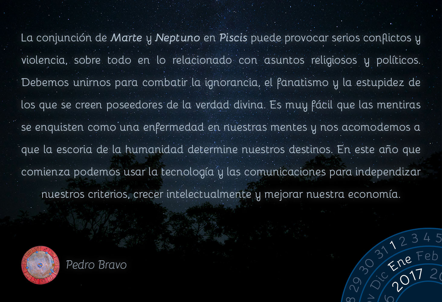 La conjunción de Marte y Neptuno en Piscis puede provocar serios conflictos y violencia, sobre todo en lo relacionado con asuntos religiosos y políticos. Debemos unirnos para combatir la ignorancia, el fanatismo y la estupidez de los que se creen poseedores de la verdad divina. Es muy fácil que las mentiras se enquisten como una enfermedad en nuestras mentes y nos acomodemos a que la escoria de la humanidad determine nuestros destinos. En este año que comienza podemos usar la tecnología y las comunicaciones para independizar nuestros criterios, crecer intelectualmente y mejorar nuestra economía.