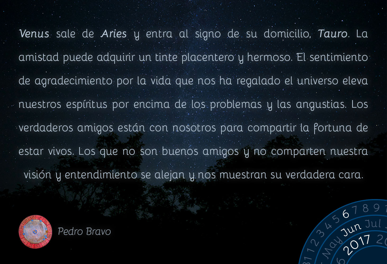 Venus sale de Aries y entra al signo de su domicilio, Tauro. La amistad puede adquirir un tinte placentero y hermoso. El sentimiento de agradecimiento por la vida que nos ha regalado el universo eleva nuestros espíritus por encima de los problemas y las angustias. Los verdaderos amigos están con nosotros para compartir la fortuna de estar vivos. Los que no son buenos amigos y no comparten nuestra visión y entendimiento se alejan y nos muestran su verdadera cara.