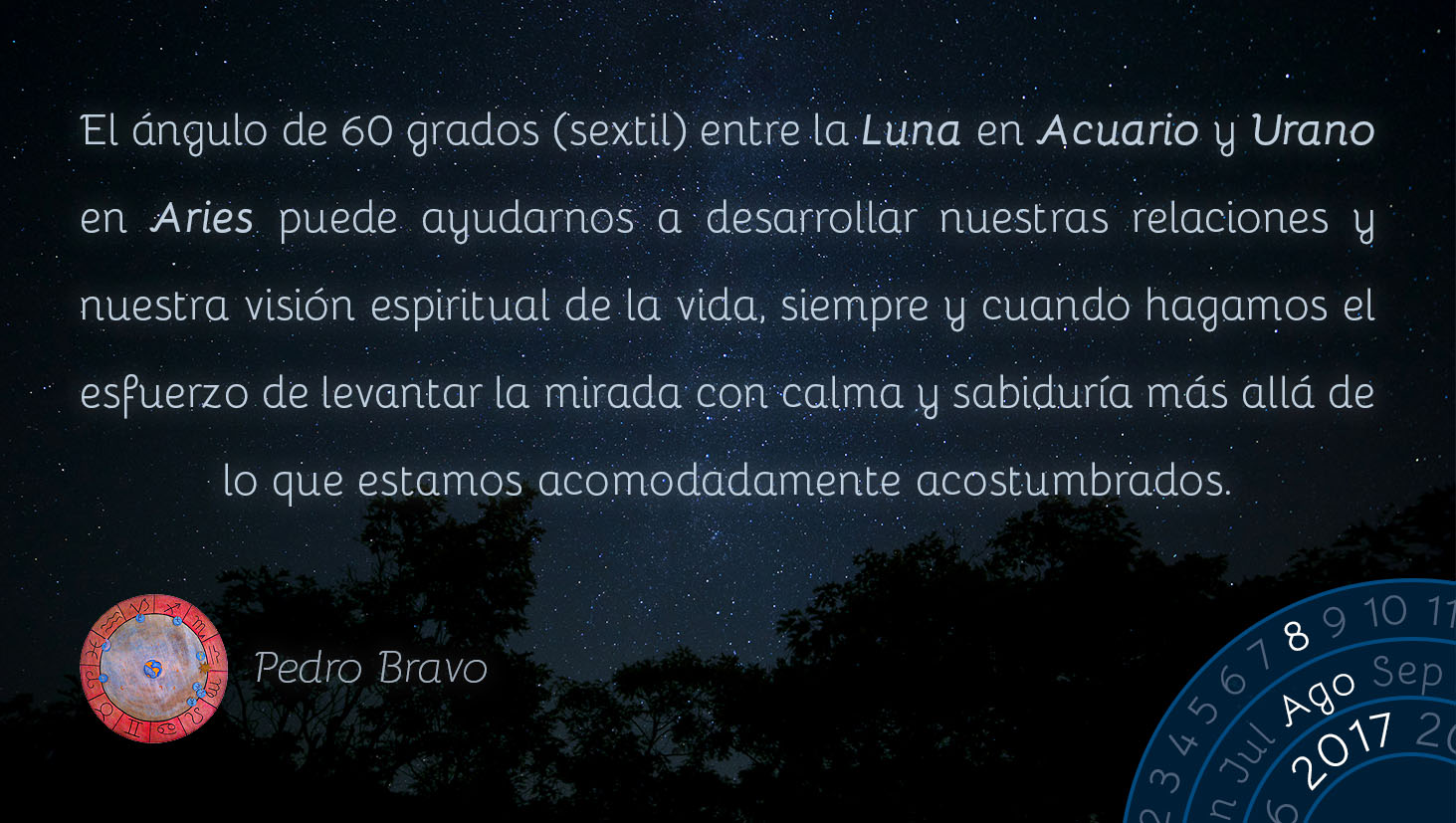 El ángulo de 60 grados (sextil) entre la Luna en Acuario y Urano en Aries puede ayudarnos a desarrollar nuestras relaciones y nuestra visión espiritual de la vida, siempre y cuando hagamos el esfuerzo de levantar la mirada con calma y sabiduría más allá de lo que estamos acomodadamente acostumbrados.