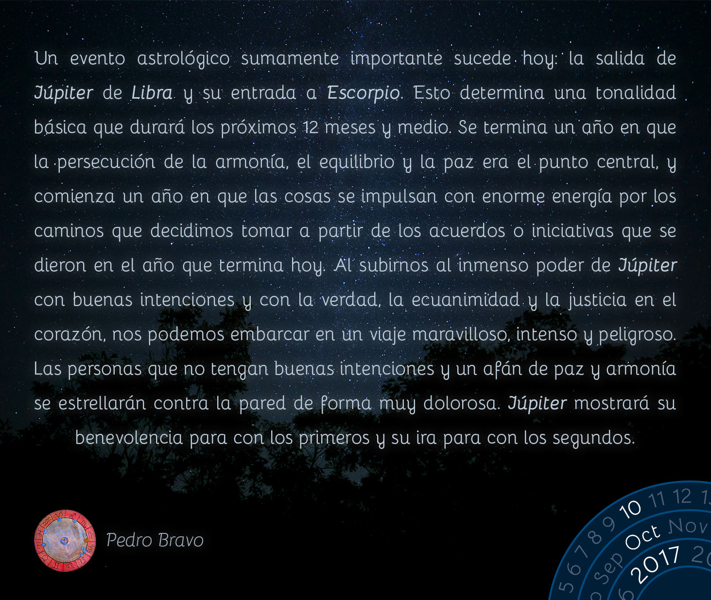 Un evento astrológico sumamente importante sucede hoy: la salida de Júpiter de Libra y su entrada a Escorpio. Esto determina una tonalidad básica que durará los próximos 12 meses y medio. Se termina un año en que la persecución de la armonía, el equilibrio y la paz era el punto central, y comienza un año en que las cosas se impulsan con enorme energía por los caminos que decidimos tomar a partir de los acuerdos o iniciativas que se dieron en el año que termina hoy. Al subirnos al inmenso poder de Júpiter con buenas intenciones y con la verdad, la ecuanimidad y la justicia en el corazón, nos podemos embarcar en un viaje maravilloso, intenso y peligroso. Las personas que no tengan buenas intenciones y un afán de paz y armonía se estrellarán contra la pared de forma muy dolorosa. Júpiter mostrará su benevolencia para con los primeros y su ira para con los segundos.