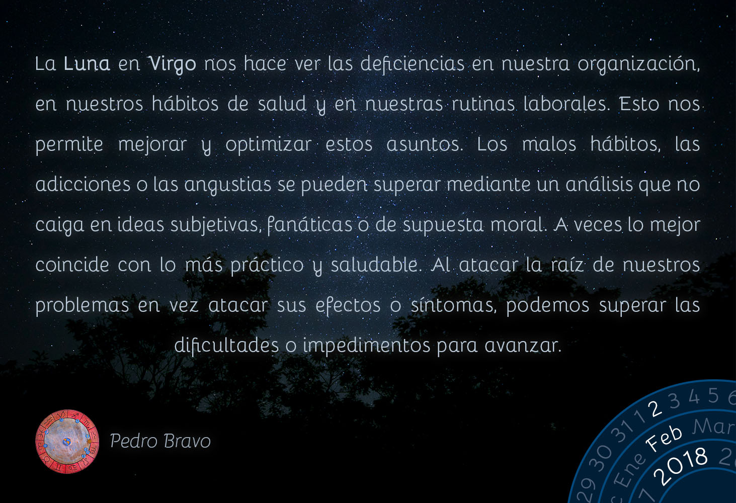 La Luna en Virgo nos hace ver las deficiencias en nuestra organización, en nuestros hábitos de salud y en nuestras rutinas laborales. Esto nos permite mejorar y optimizar estos asuntos. Los malos hábitos, las adicciones o las angustias se pueden superar mediante un análisis que no caiga en ideas subjetivas, fanáticas o de supuesta moral. A veces lo mejor coincide con lo más práctico y saludable. Al atacar la raíz de nuestros problemas en vez atacar sus efectos o síntomas, podemos superar las dificultades o impedimentos para avanzar.